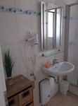 Das großzügige Duschbad ist mit einem Waschtisch, Handtuchtrockner und Fön ausgestattet.